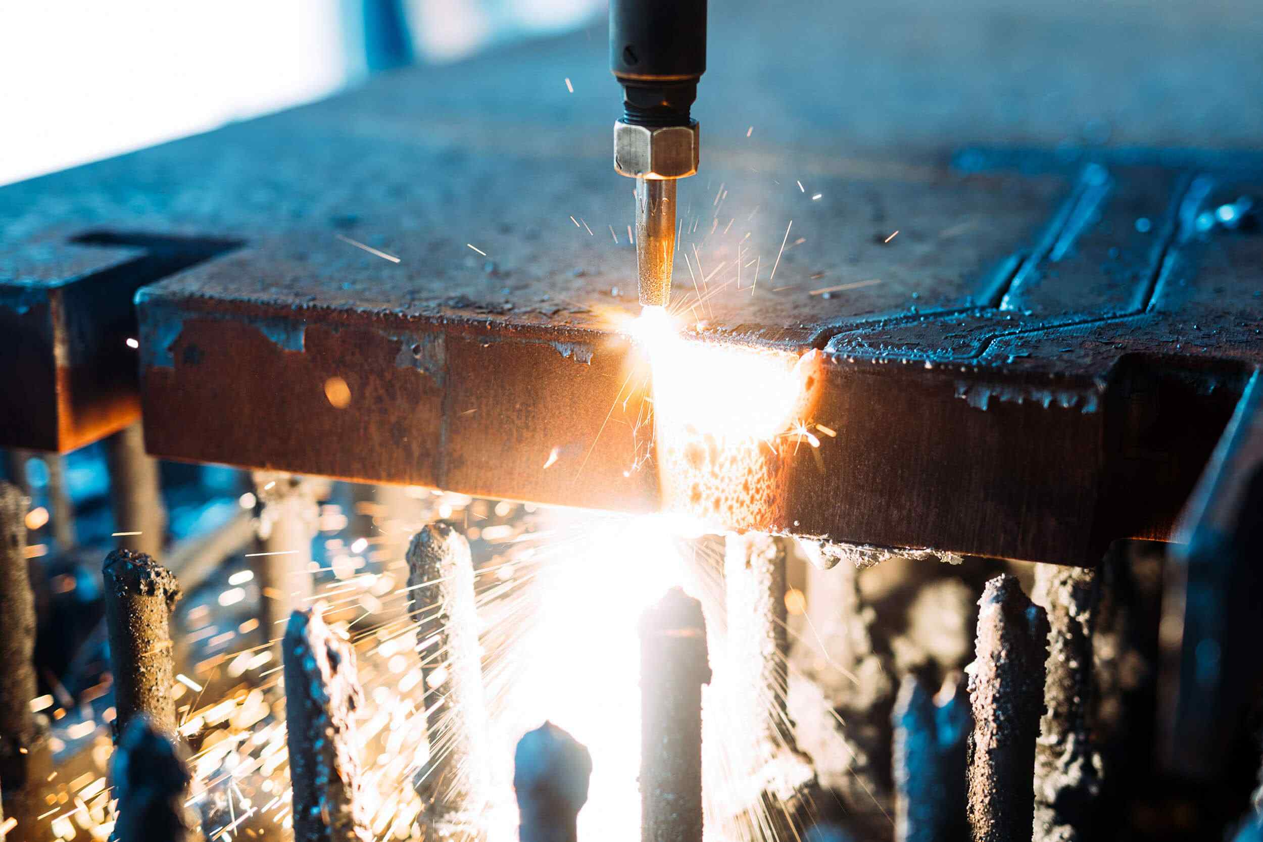 CNC laser cutting is a non-contact, thermal-based process. A CNC laser cutter features a laser head containing a laser focusing lens and a nozzle. Through the nozzle, this head and lens assembly focuses a laser beam — a column of very high-intensity light on the workpiece, melting and cutting the workpiece to form the desired shape. CNC lasers employ compressed gas to cool the focusing lens and expel the vaporized metal out of the workpiece.